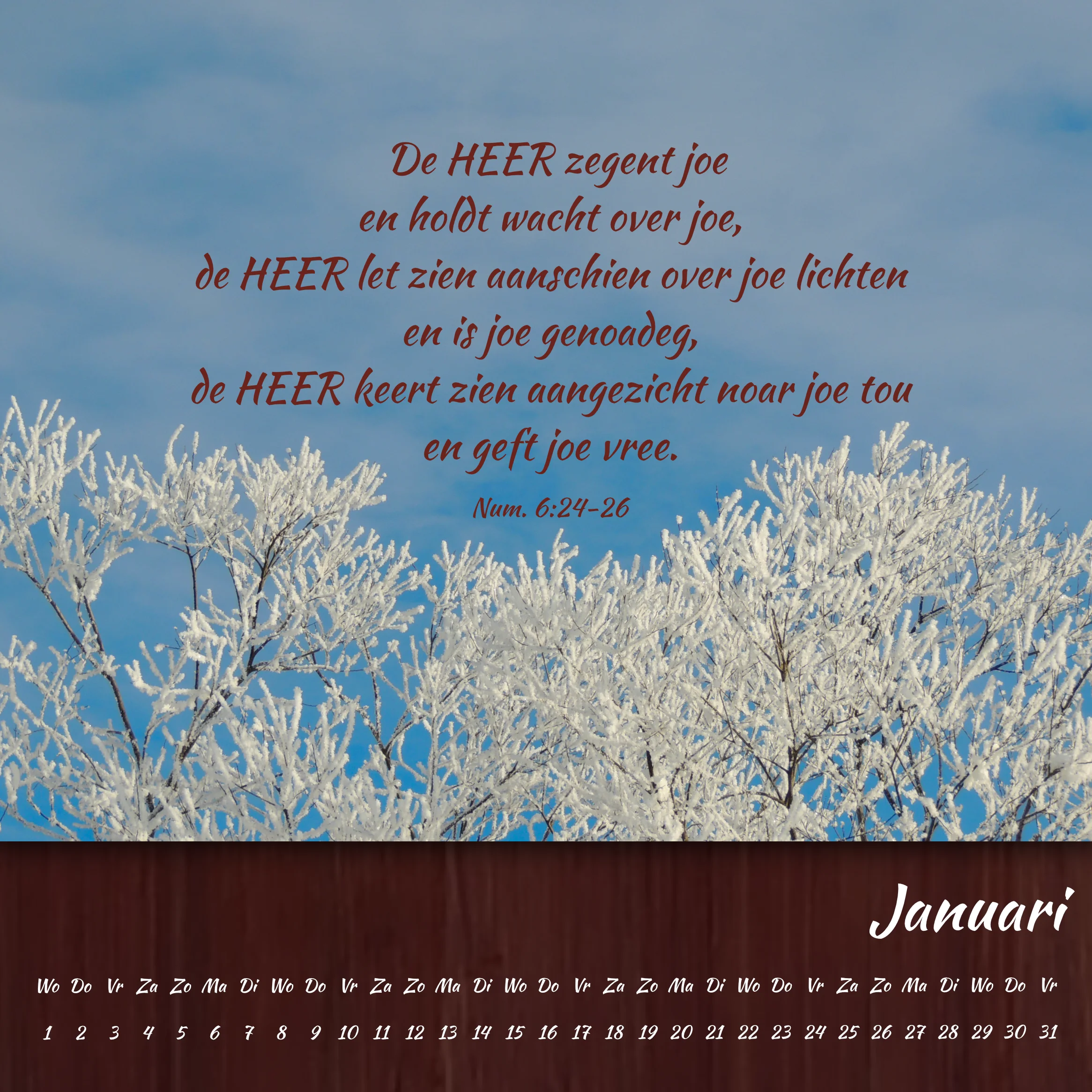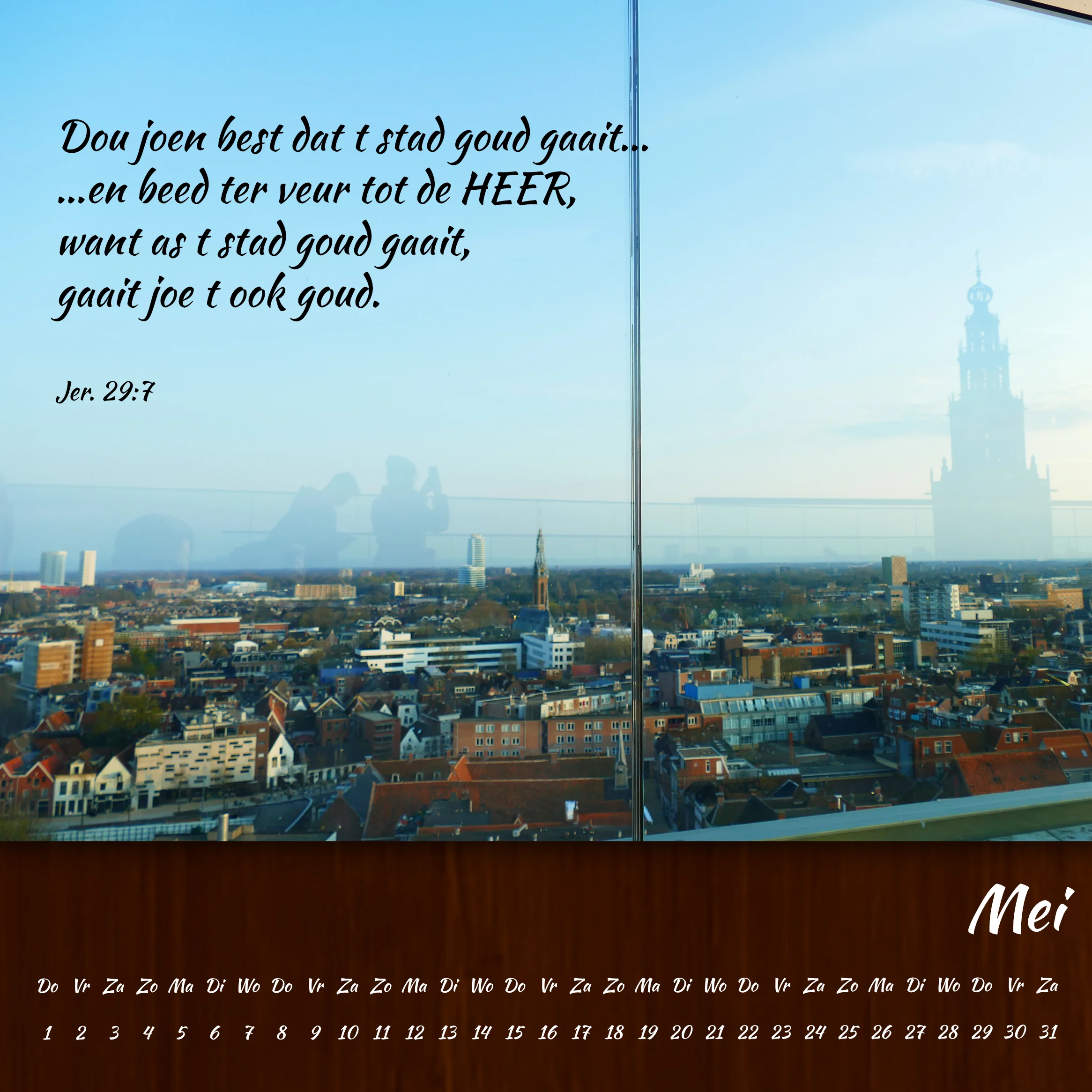 De kalender is gemaakt door Andreas Bauer. Zijn vrouw Pieternel Bauer-Wigboldus heeft vroeger meegewerkt aan de vertaling van de Psalmen in het Gronings. Samen hebben zij 12 jaar in Ethiopië gewoond en meegewerkt aan de vertaling van de Bijbel in de Zayse-taal. Nog steeds zetten zij zich in voor verschillende Bijbelvertaalteams aldaar en voor een kinderbijbel in verschillende Ethiopische talen. De opbrengst van de kalenderverkoop komt dit werk ten goede.